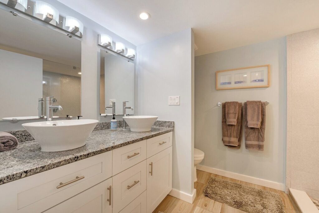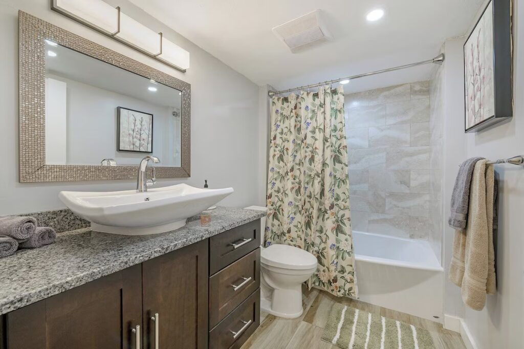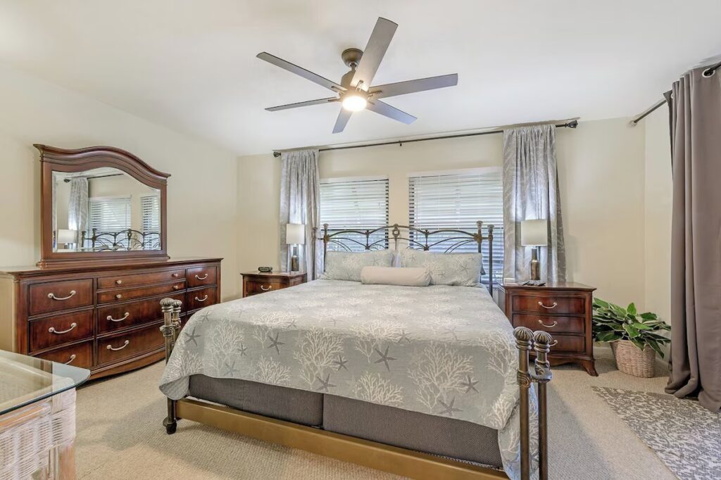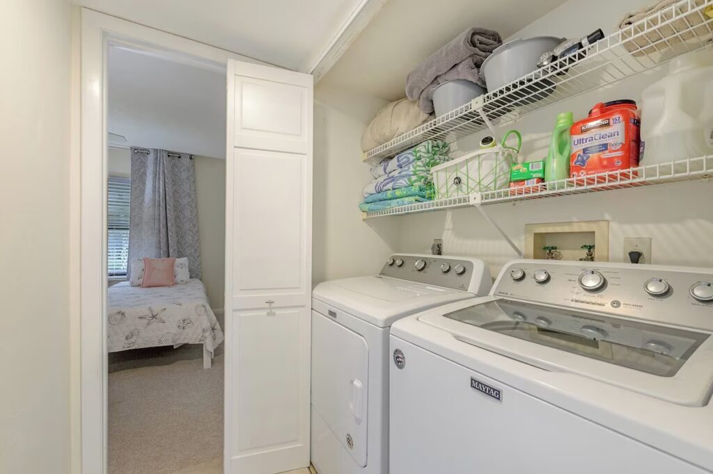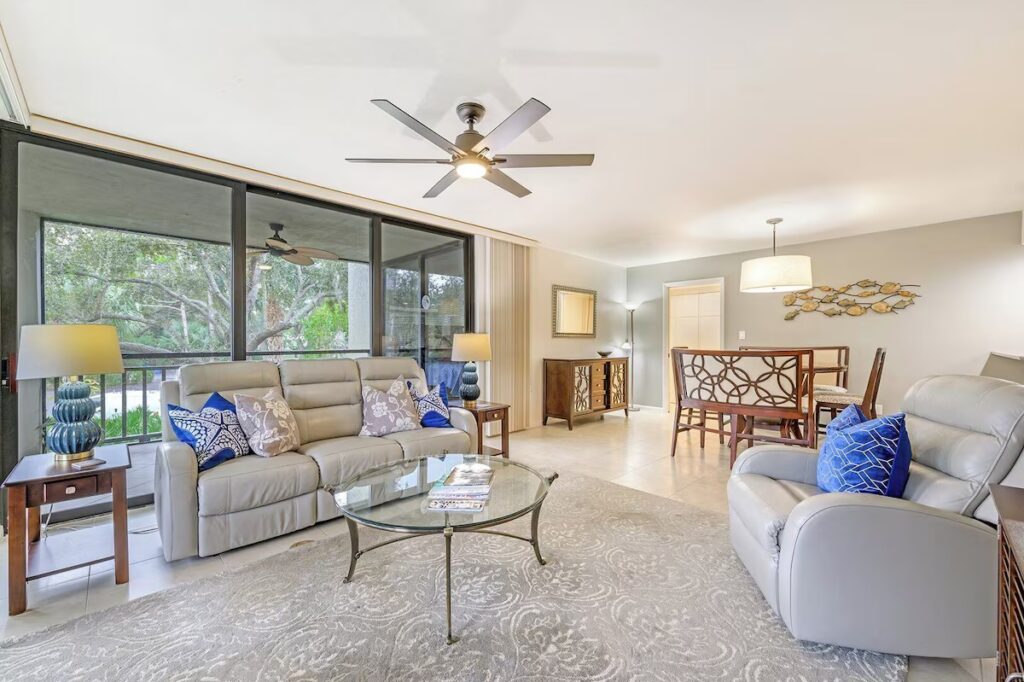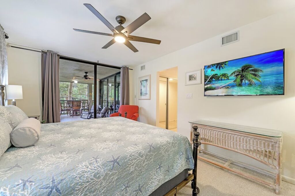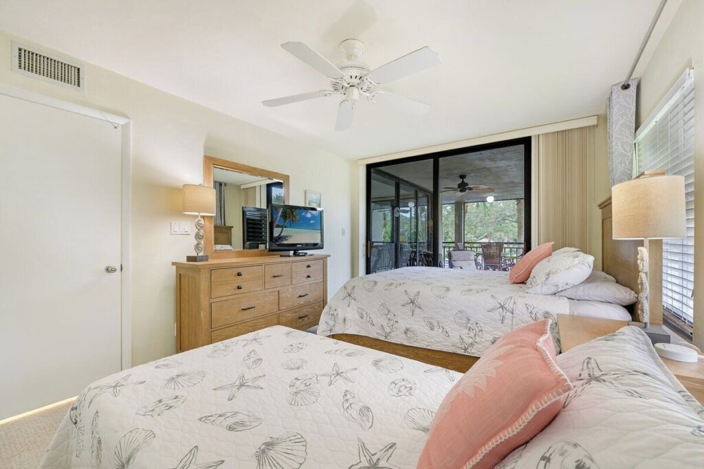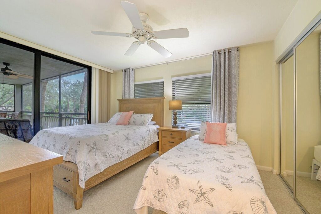 Enjoy high-speed internet and cable TV on the 65″ TV in the living area and 43″ TV in both bedrooms The King bed in the primary bedroom and Queen and XL Twin in the guest room all boast new, super comfortable, Tufts and Needle mattresses. The unit is equipped with all of the kitchenware items you need. The pool, hot tub and pool house amenities areas are just steps outside your door.