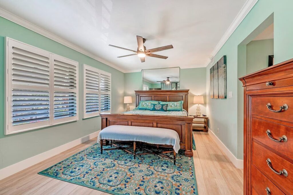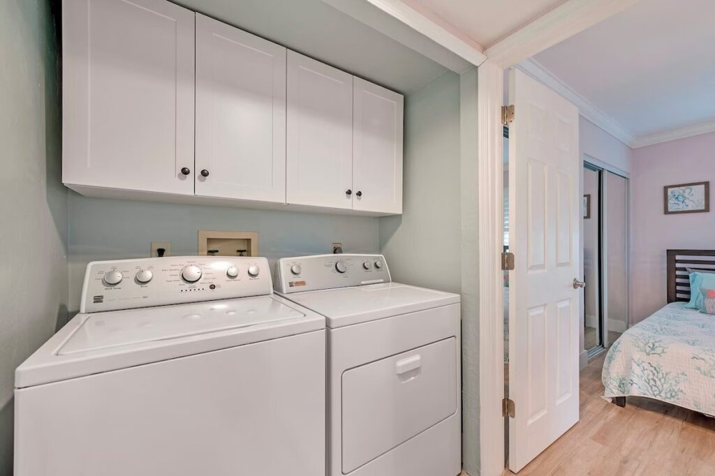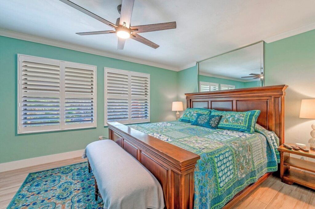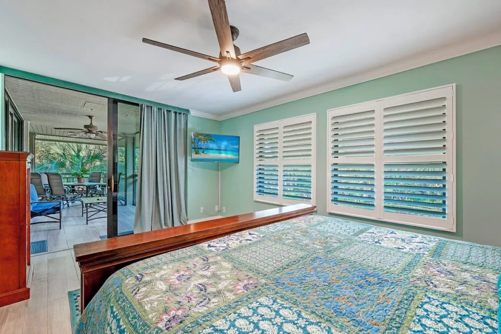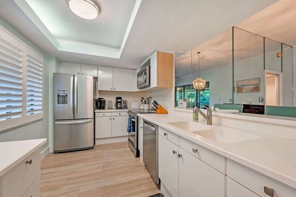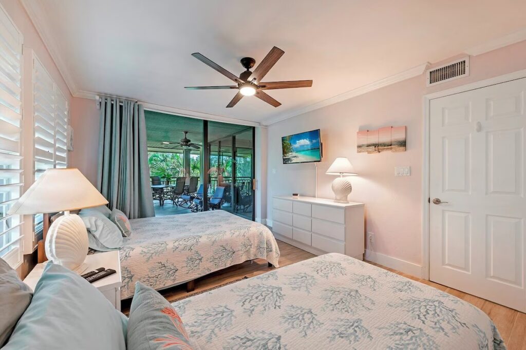Renovated in 2021, you’ll find a King bed in the primary bedroom & a Queen and XL Twin bed in the guest bedroom with elite Tufts and Needle mattresses. Enjoy high-speed internet and cable TV powering the 55″ TV in the living area and 43″ TV in both bedrooms. Be part of nature as you view your surroundings through an 8′ high sliding glass door system enabling 16′ of panoramic open air to the lanai and beyond. The condo has Luxury laminate flooring throughout. The kitchen is fully stocked with all the kitchenware you will need. The pool, hot tub and pool house amenities areas are just steps outside your door.
